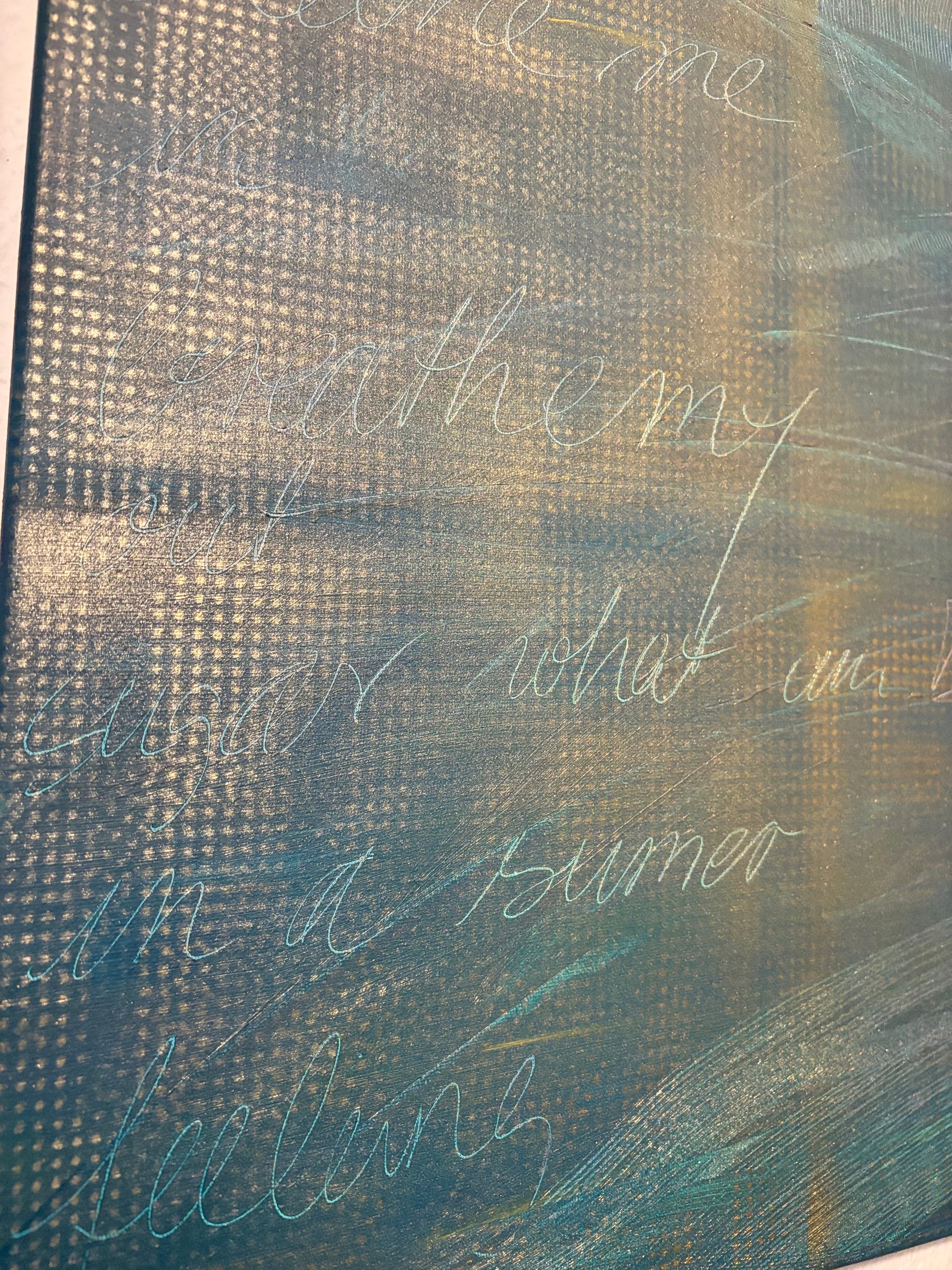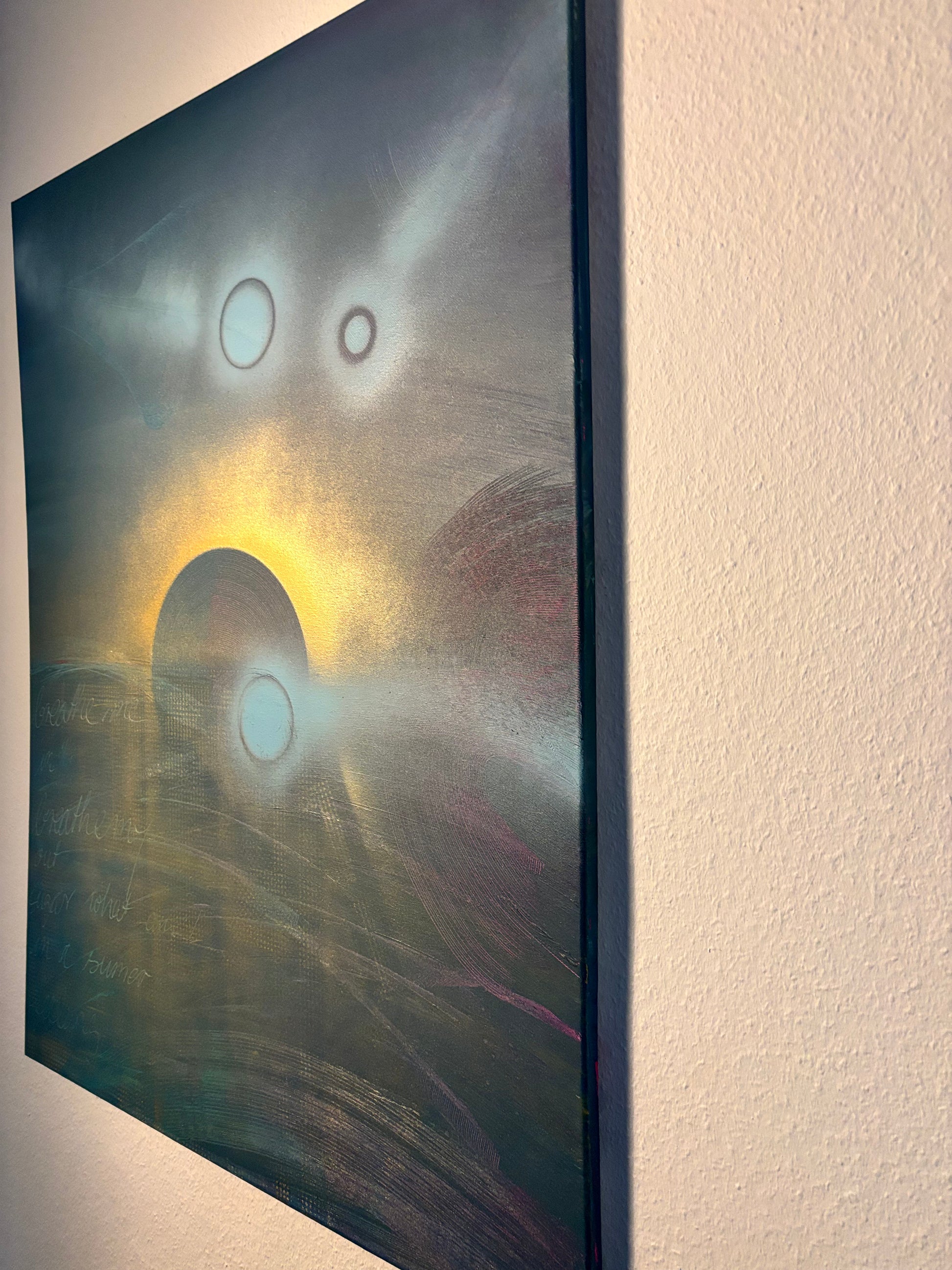 Zwischen den Farbschichten blitzen zarte Pinktöne hervor – ein leises Aufglimmen, das Wärme und Lebendigkeit in die kühle Komposition bringt. Kreisformen strukturieren den Bildraum und erinnern an Sphären, Horizonte oder Energiefelder. In die Oberfläche sind feine Schriftzüge eingeritzt, die wie Spuren von Gedanken oder Erinnerungen wirken – geheimnisvoll, kaum lesbar, und doch voller Bedeutung.