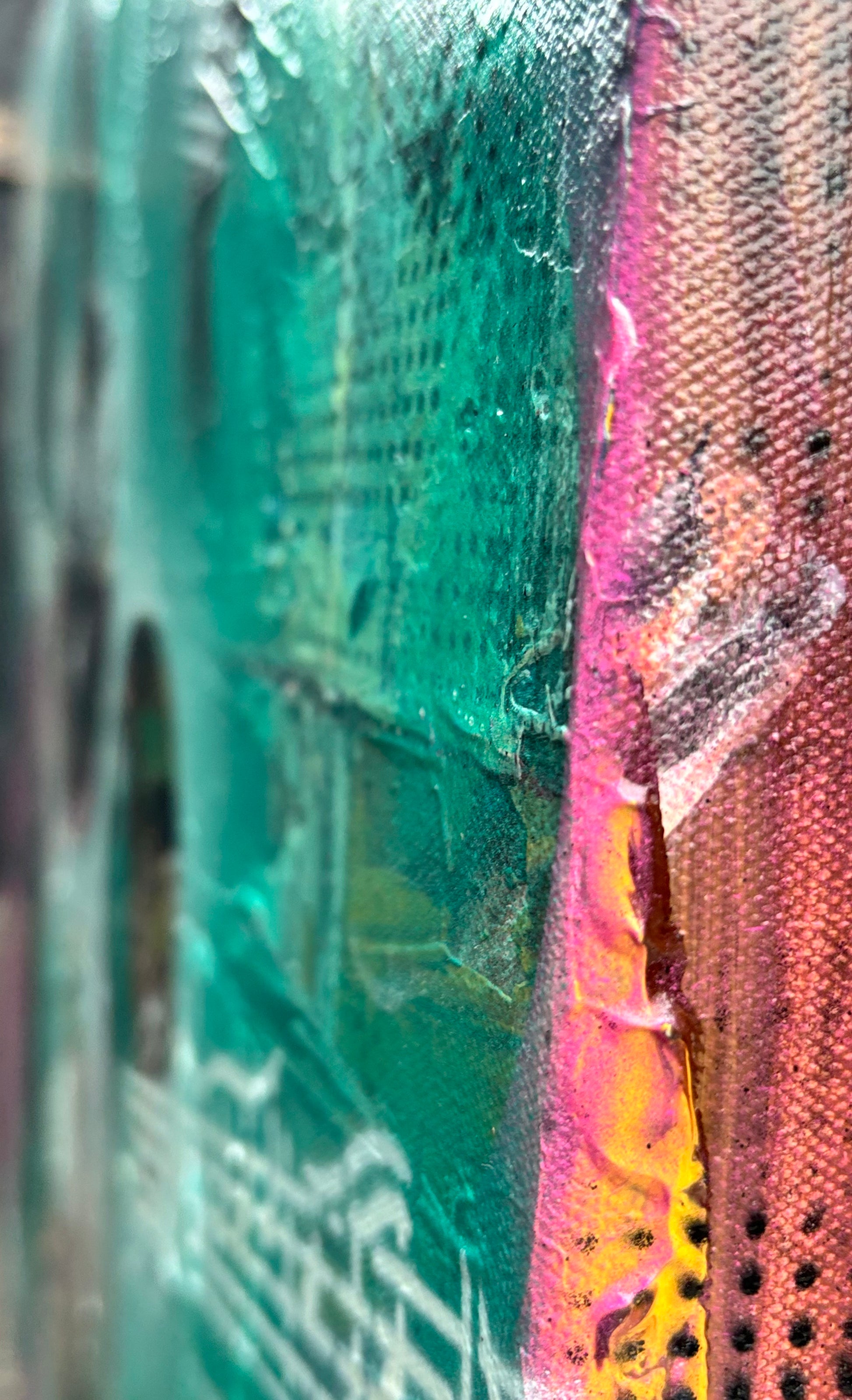 Der bemalte Rand der Leinwand betont den Objektcharakter des Werkes und öffnet die Komposition über die Fläche hinaus. Farbe, Bewegung und Bedeutung verschmelzen zu einem vielschichtigen Bild über Kunst, Identität und Sichtbarkeit.