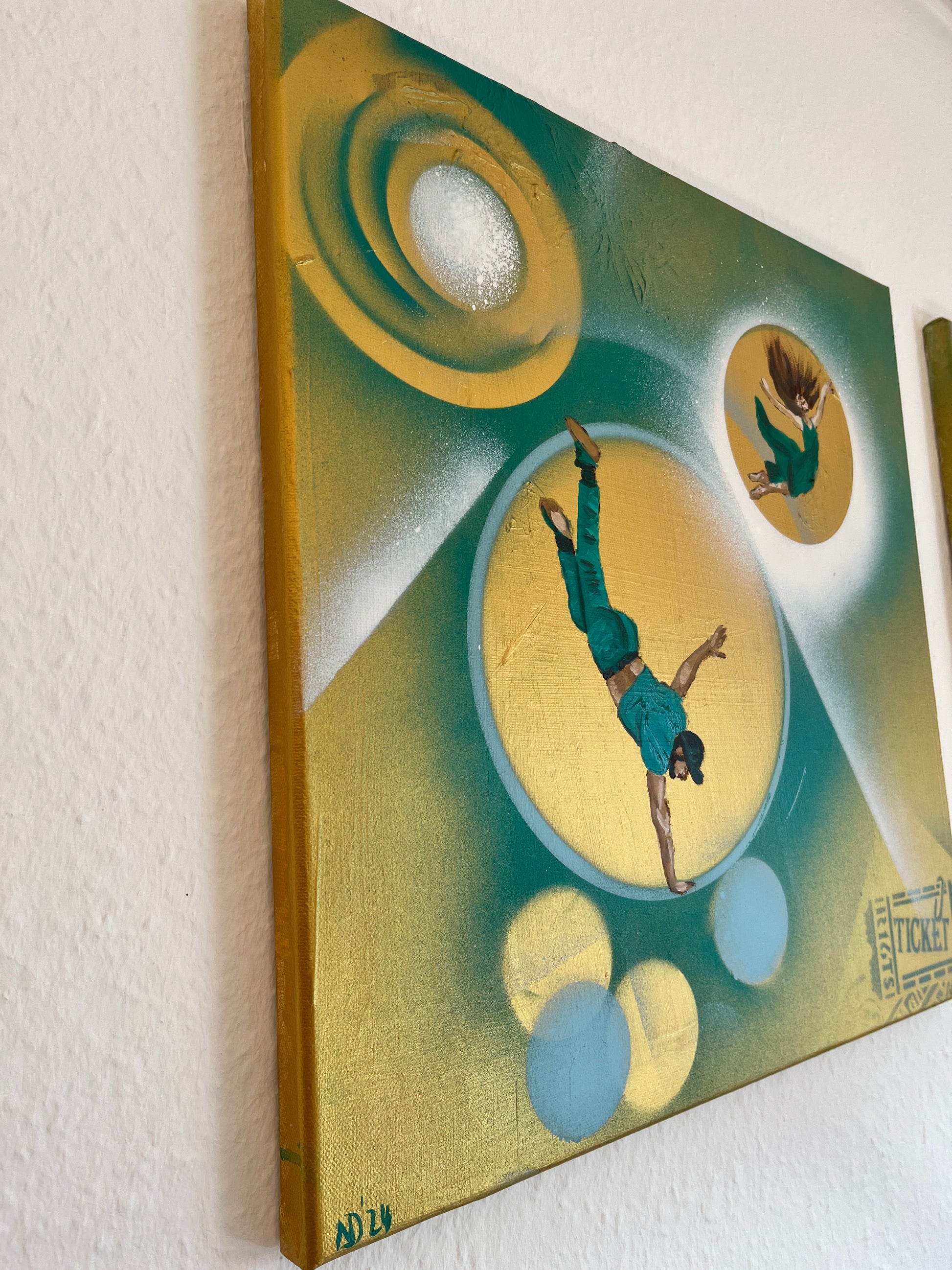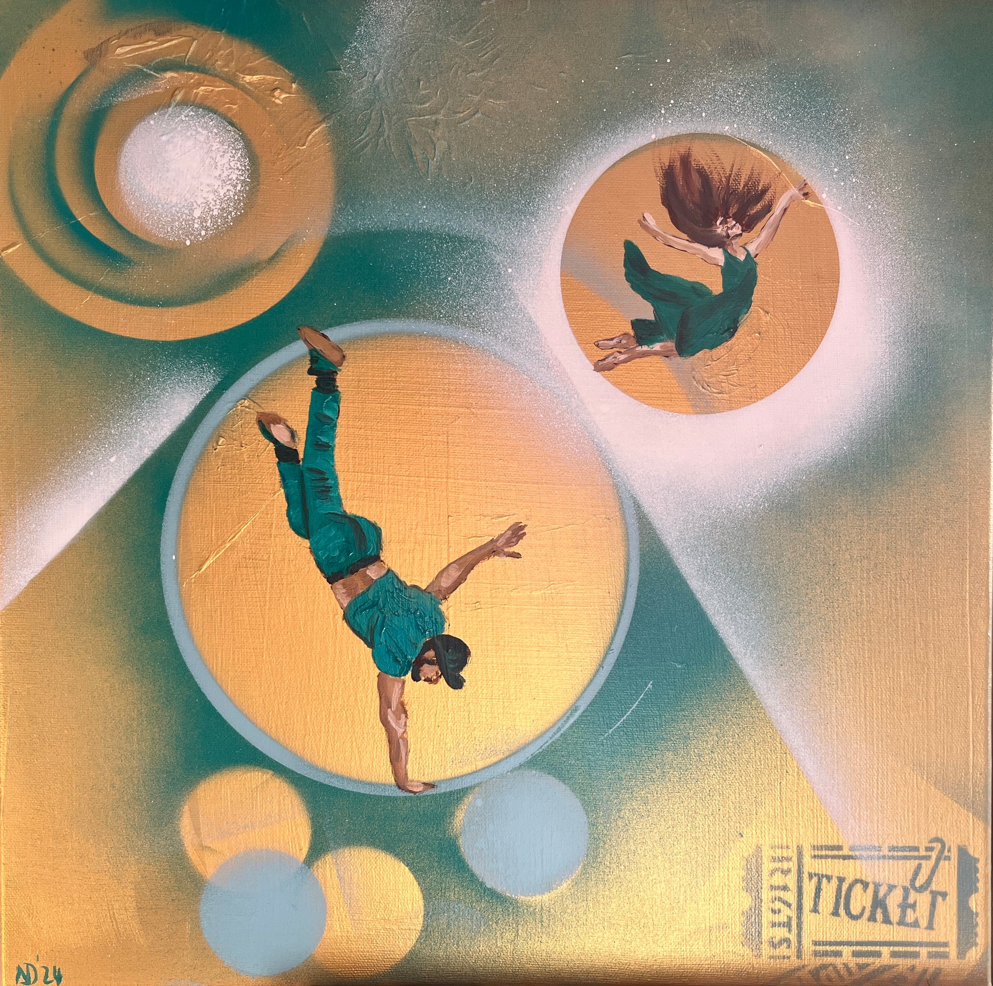 Showticket I ist ein beeindruckendes Originalkunstwerk aus der Serie „Move meets illusions“. Das 40x40 cm große Gemälde kombiniert Acrylfarbe und Sprühtechnik auf Leinwand sowie ein in Öl gemaltes tänzerisches Motiv. Jedes Detail unterstreicht die dynamische Bewegung und Illusion der Darstellung. Das Werk wird inklusive eines passenden Rahmens geliefert und ist ein einzigartiges Unikat mit Echtheitszertifikat – ideal für Kenner und Sammler, die originelle Kunst mit ausdrucksstarker Präsenz schätzen.
